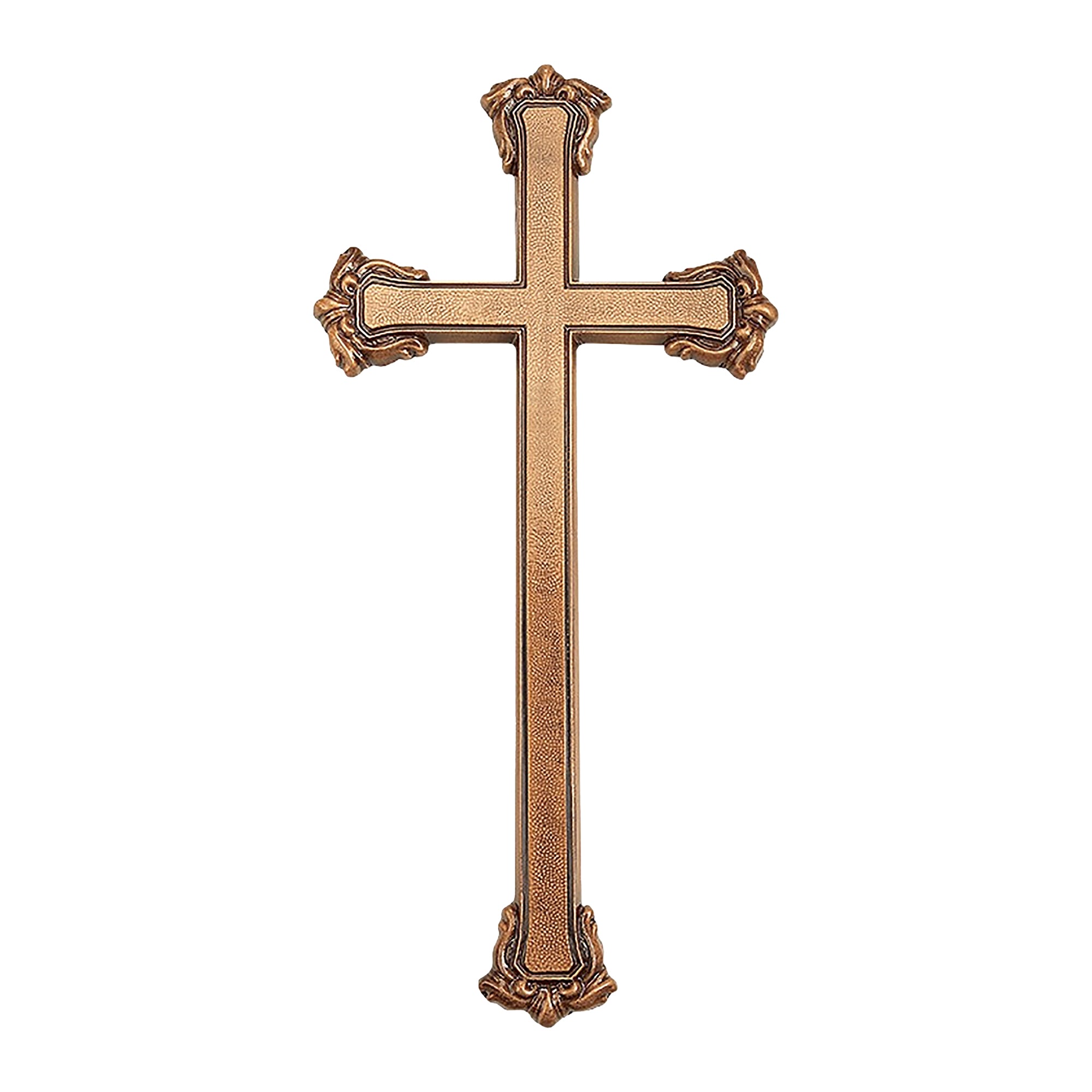 This cross features a textured finish. Designed for outdoor use, it is made from brass to ensure durability and resistance to outdoor weather conditions.